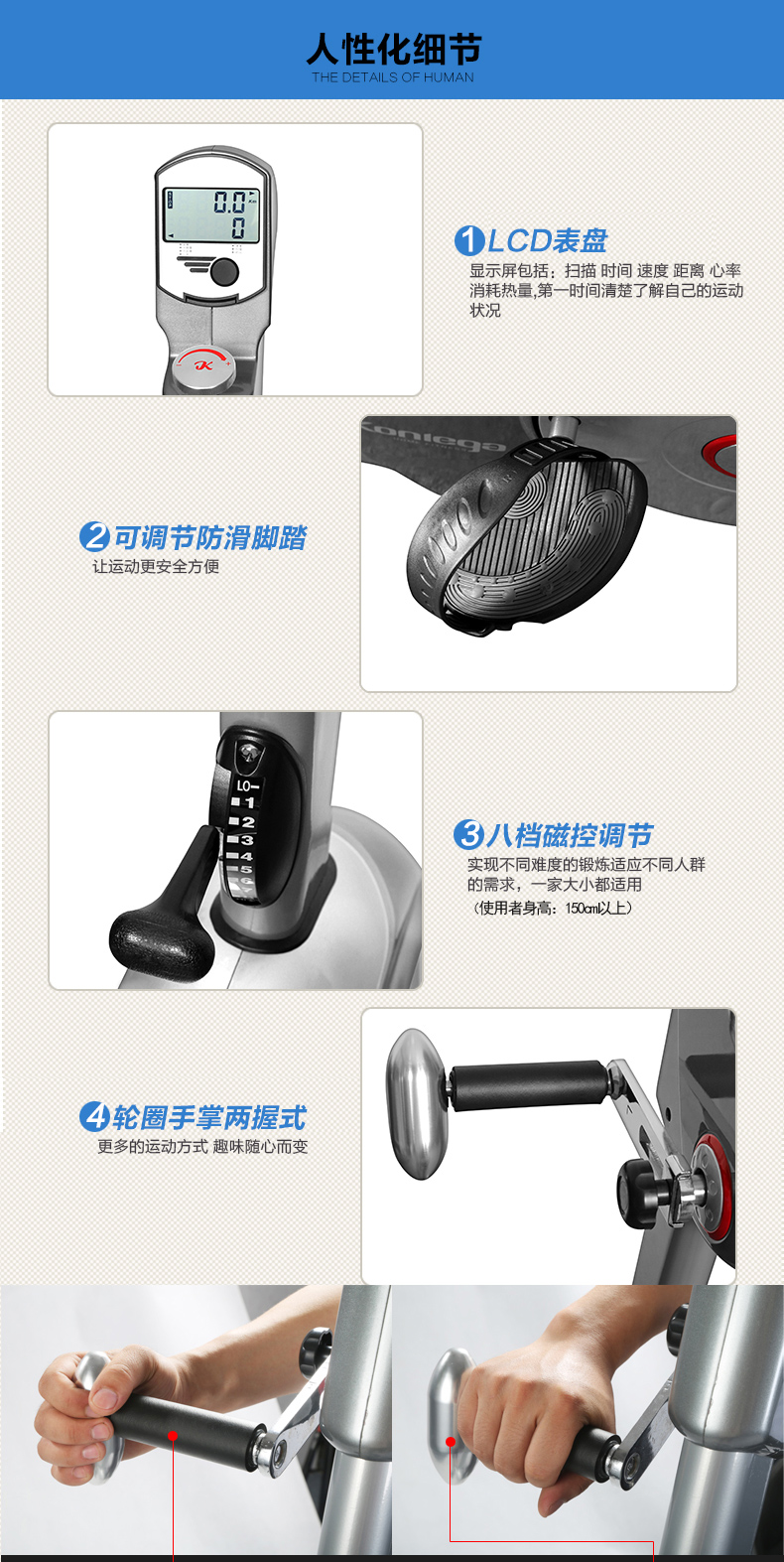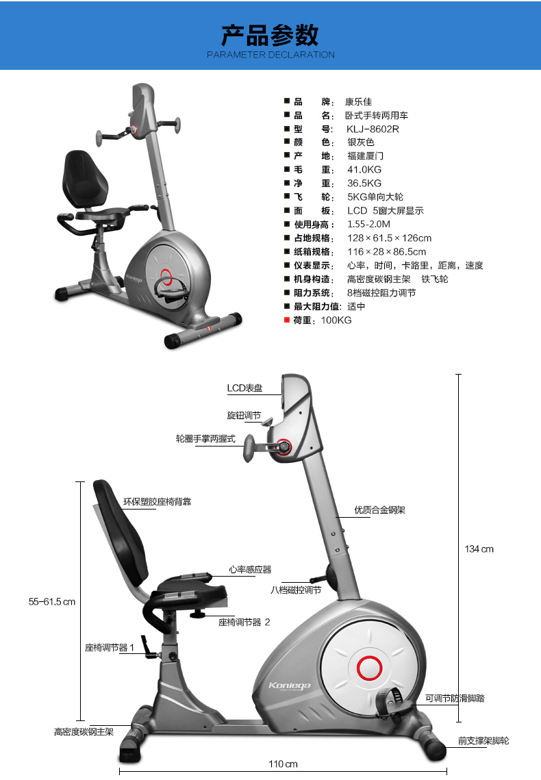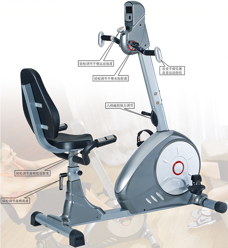 康复上肢,下肢锻炼,8档阻力调节,显示时间,速度,距离,心率,热量等