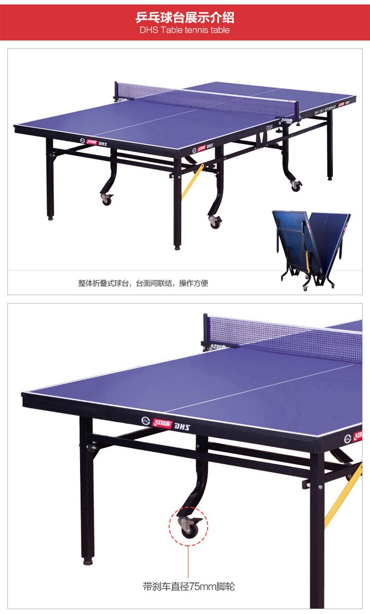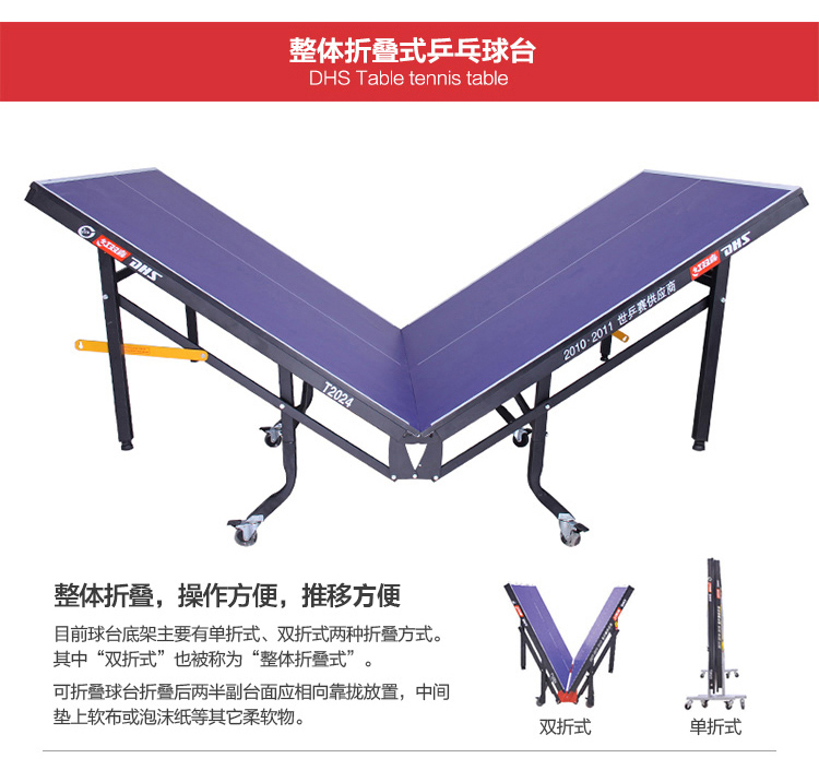 整体折叠 带轮移动式 折叠移动方便,配有红双喜网架、球网、乒乓球、乒乓球拍